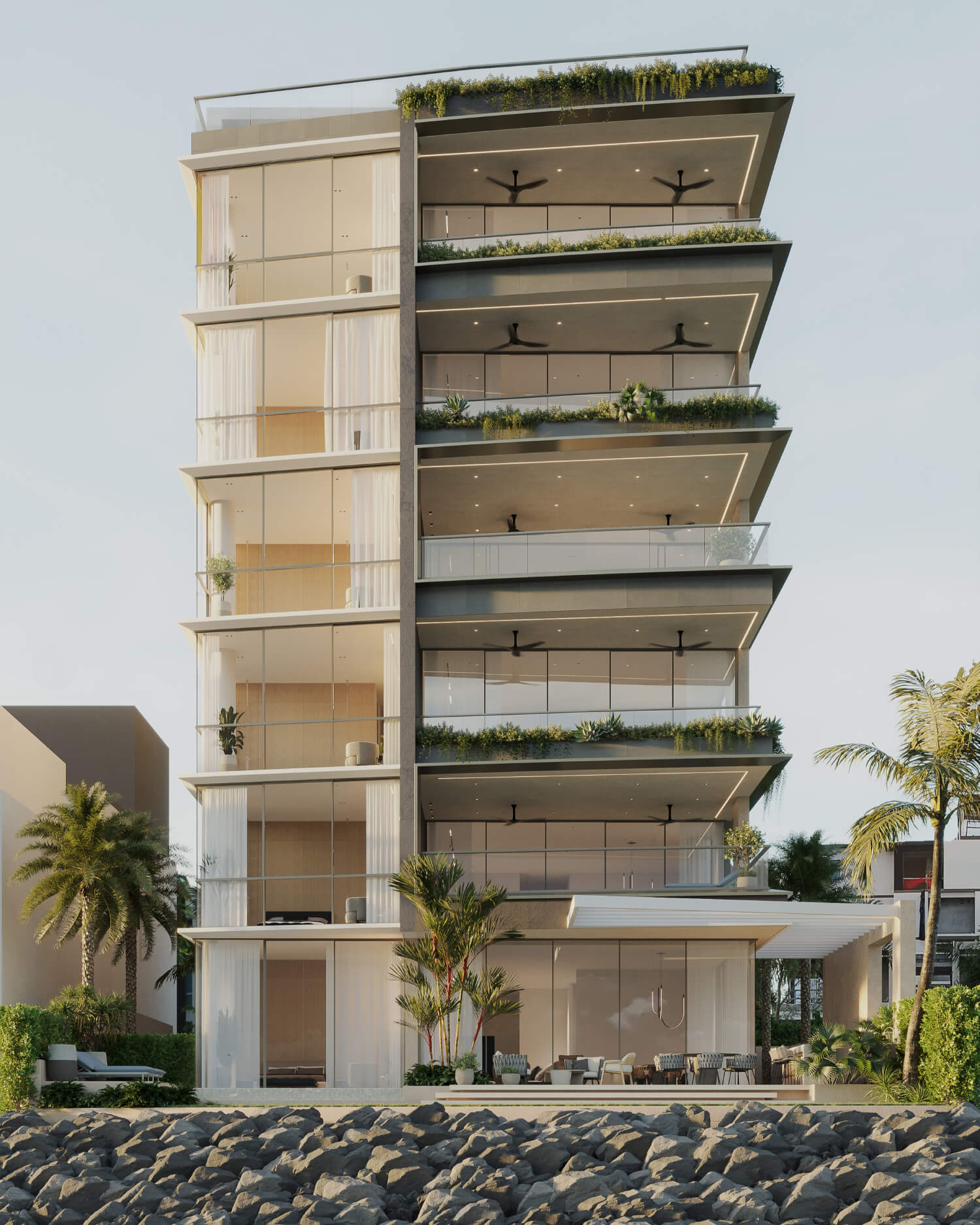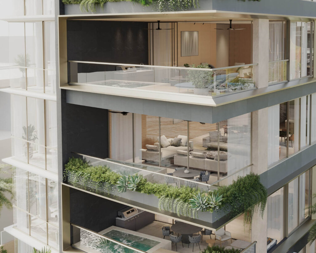 Edificio de solo 6 apartamentos, uno por piso, con un diseño de fachada único y lujoso, ayudando a seguir mejorando el skyline de Ocean Reef.